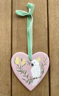 Add a pretty touch to your Christmas tree or brighten up your room with this beautifully handcrafted hanging heart, featuring a sweet cockatoo nestled among vibrant banksia flowers. These make lovely gifts for Christmas or for any special occasion.