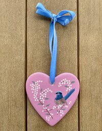 Add a gorgeous touch to your Christmas tree or brighten up your room with this beautifully handcrafted hanging heart, featuring a sweet little fairywren nestled among the blossoms. These make lovely gifts for Christmas or for any special occasion.