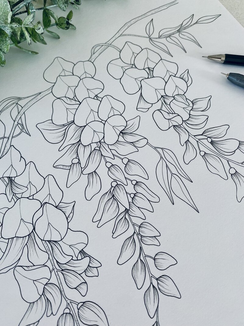 I love working in ink, it gives such a sophisticated and elegant look. I use fineliners, which are perfect for creating lots of detail in my illustrations. Many of my surface patterns start out drawn in ink which I paint with watercolour or, sometimes, colour in digitally. You'll find a selection of some of my hand drawn inky florals on this page.