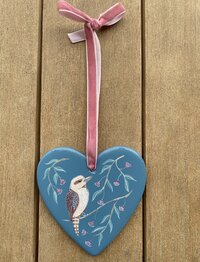 Add a pretty touch to your Christmas tree or brighten up your room with this beautifully handcrafted hanging heart, featuring a lovely kookaburra perched among the red flowering gum. These make lovely gifts for Christmas or for any special occasion.